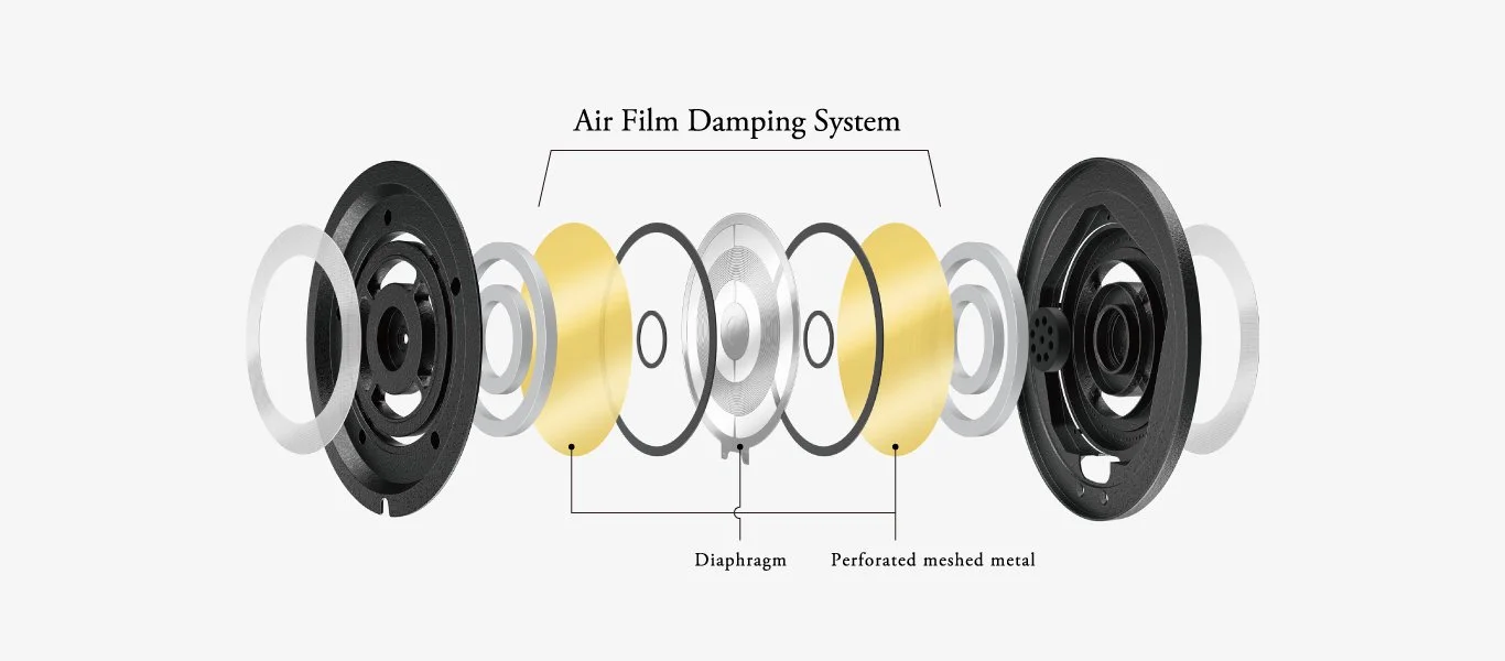 Bei den ursprünglichen planar-magnetischen Modellen ist die Schwingungsamplitude zunehmend gering und die Membran kommt in Kontakt mit dem Magneten. Um dieses Problem zu lösen, haben wir Messungen vorgenommen, indem wir mithilfe von Berechnungen nach der Finite-Elemente-Methode und Laser-Doppler-Geräten mehrfache Simulationen der Membran durchführten und eine neue Bremstechnologie für die Membran entwickelten – bekannt als AFDS – Air Film Damping System.